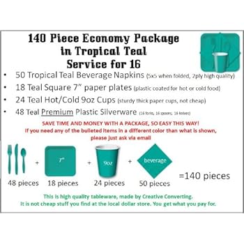 140 Piece Economy Party Supplies Package in Tropical Teal Color, has cutlery, plates, cups, napkins, forks, spoons, and knives. For weddings, anniversary, baby shower, birthday, any Party.. Reviewed by Victor F. Rating: