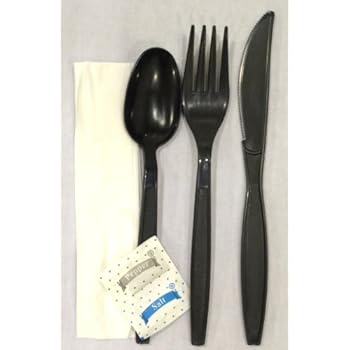 Sleek 6 in 1 Cutlery Kit Heavyweight Black Fork, Teaspoon, Knive, Napkin, Salt and Pepper Packs Individually Wrapped, 250 Per Case. Reviewed by Robert E. Rating: