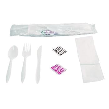 Wrapped Cutlery Kit, 6 1/4", Fork/Knife/Spoon/Napkin/Salt/Pepper, White. Reviewed by Eric G. Rating: