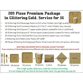 209 Piece Premium Party Supplies Package in Glittering Gold Color, has cutlery, plates, cups, napkins, forks, knives, spoons, and tablecloth. For weddings, anniversary, baby shower, birthday, any Party.. Reviewed by Perry S. Rating: